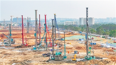 4月18日,位于琼州海峡南岸的海口新海港和南港“二线口岸”(货运)集中查验场所建设现场施工正酣。工地上桩机林立、机械轰鸣,土方运输车辆穿梭往来,数百名建设者正进行土方回填、材料加工等各项工作。