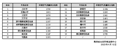 按照《环境空气质量标准》(GB3095-2012)及修改单、《环境空气质量评价技术规范(试行)》(HJ663-2013)和《城市环境空气质量排名技术规定》(环办监测〔2018〕19号)评价,2023年3月,全省环境空气质量优良天数比例为97.6%,其中优级天数比例为65.4%,良级天数比例为32.2%,轻度污染天数比例为2.4%,无中度及以上污染天。环境空气质量排名靠前的市县分别是三沙市、五指山市和三亚市,排名靠后的市县分别是昌江黎族自治县、临高县和东方市。2023年3月全省19个市县环境空气质量排名如右: