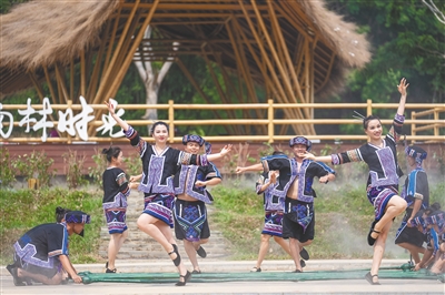 ④ 4月22日,在五指山市水满乡毛纳村的直播节目中,演出人员跳起竹竿舞。 本报记者 李天平 摄