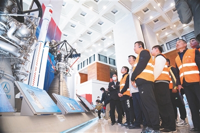 4月23日,中建三局顺义航天产业园项目一线建设者在参观“逐梦寰宇问苍穹——中国载人航天工程三十年成就展”。新华社发