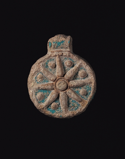 细看挂坠上的图案,是带有八条光芒的金星,每条光芒之间均匀分布着圆点装饰,该图案是古巴比伦自然与丰收女神伊什塔尔的象征,伊什塔尔同时也是主司爱情、生育及战争的女神,并与金星有关,因此伊什塔尔之星也象征着金星。