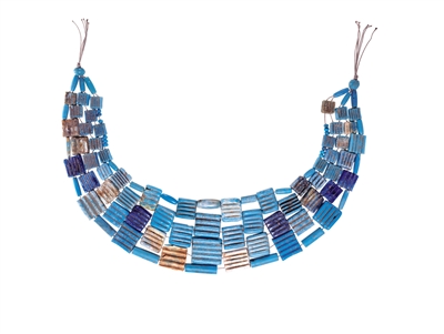 漫步展厅,首先映入眼帘的是一组来自公元前14世纪北美索不达米亚的项链。项链的材质主要是深浅不一的蓝色玻璃方形串珠,辅以管状、圆珠状等其他形状的玻璃串制而成。