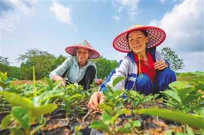 四月二十五日,白沙黎族自治县南开乡革新村村民在茶树苗种植基地里劳作。本报记者 李天平 摄