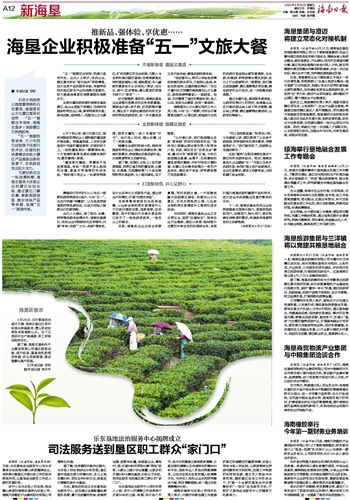 4月26日,白沙黎族自治县牙叉镇,海南农垦白沙茶叶标准化种植基地,漫山茶树如绿色地毯铺陈山头。当下正是茶叶生产高峰季,茶工穿梭田间劳作忙。