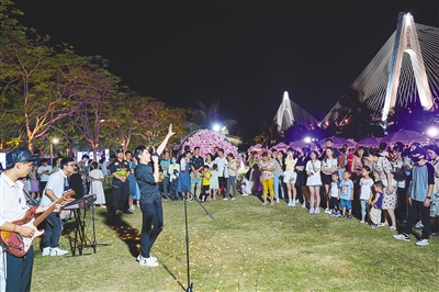 市民在海口世纪大桥下看演出。 海南日报记者 封烁 摄