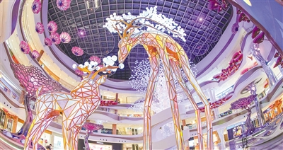 雾气弥漫的神秘山巅、月光铺洒的岩石海岸、灵蝶起舞的水上森林、神鹿驰骋的繁花山谷……走进海口国际免税城一楼的天际秘林主题中庭,你会立即被建设者结合海南地域特点营造出的沉浸式购物空间吸引,瞬间体会到时尚感。