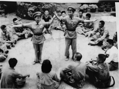 1950年夏,琼崖纵队改编为中国人民解放军海南军区。节假日期间,部队战士就在营地草地上围坐着自演自乐。(吴之摄影作品)