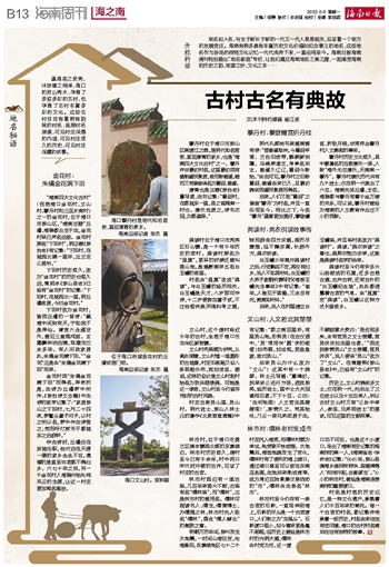 村名是村落的历史记忆,是一种文化遗产,承载着人们千百年来的寄托。每一个古老的村名,都记载并传承着一段历史,村名由来往往有迹可循,海口的古村村名背后往往有独特的故事。
