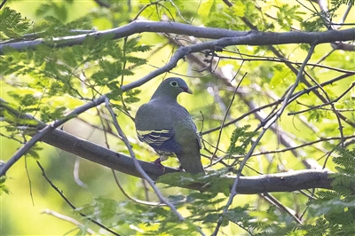 近日,身形似鸽子的厚嘴绿鸠现身昌江海尾国家湿地公园(试点),这是该湿地公园发现的第196种鸟类。“在湿地开展这么高密度的生态监测3年多以来,却第一次发现它,是非常难得一见的国家二级保护鸟类。”海南昌江海尾国家湿地公园管理中心副主任薛美丽在5月6日的一次湿地巡护时发现了它。