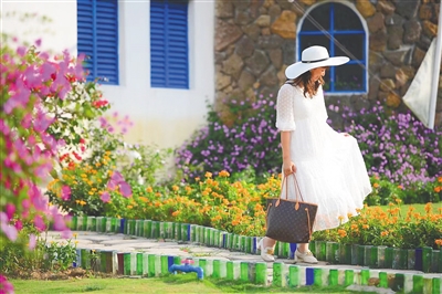 坐在咖啡长廊下闲饮,只见一棵翠绿的芳香万寿菊正从栏杆缝隙中探出头来,纤细柔软的叶片随风摇曳,游客轻轻抚摸,去时手无味,回时已染香。此香甚甜,如柠檬、薄荷般清新,闻之沁润心脾。而一株正开着紫色花朵的紫娇花,花形雅致,细长的叶子散发着类似韭菜的味道。