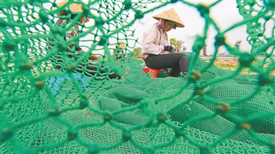 在儋州市白马井中心渔港,渔民们休渔期忙着修补渔网。