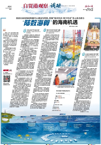 ■ 本报记者 王迎春蔚蓝,广阔,大海无声涌动,蕴含着无尽的可能。在陵水黎族自治县英州镇清水湾近海一带,海平面以下30余米处,重达1300吨的数据舱躺卧在海底。