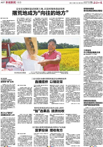 让龚春勋受益的“菠萝险”是万宁市2023年创新推出的菠萝价格保险,这种农业保险,由市级财政给予50%的保费补贴,农户自缴50%的保费,“万宁推出菠萝险,是为了助推菠萝特色产业发展,让农户减少因市场波动造成的经济损失,保障农民增收。”万宁市农业农村局副局长谢江华说,今年人保财险万宁支公司实现了菠萝价格保险业务落地,为龙滚镇、山根镇共16户菠萝种植大户提供了2199万元的风险保障,按照保险协议,16户种植大户合计获得赔付234.56万元。