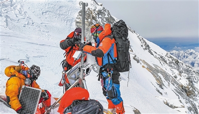 当日凌晨3时,科考队员从海拔8300米的突击营地出发,历经数小时攀登,终于抵达海拔8830米的世界最高自动气象观测站。固定钢筋绳索,更换蓄电池,安装风速风向传感器……经过约1小时的紧张工作,气象站零部件升级工作全部完成。随后,他们攀登至8848.86米的峰顶,利用工具成功采集雪冰样品。
