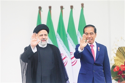 5月23日,在印度尼西亚茂物总统府,印尼总统佐科(右)欢迎到访的伊朗总统易卜拉欣·莱希。新华社发