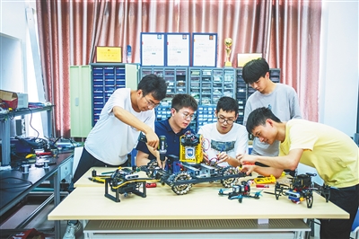 5月24日,海南大学信息与通信工程学院的师生在该院实验室调试机器人,为冲刺RoboMasters全国大学生机器人大赛做好准备。