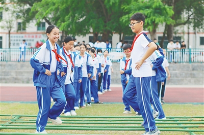 澄迈县昆仑学校以竹竿舞作为全校大课间操。(省民宗委供图)