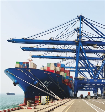 远洋油轮在洋浦国际集装箱码头的靠泊装卸。李优 摄