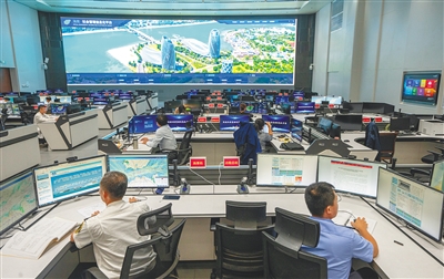在海南社会管理信息化平台指挥中心,工作人员在各自岗位上忙碌。本报记者 袁琛 摄