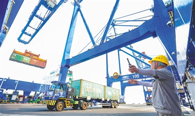 日前,在洋浦经济开发区国际集装箱码头,工人指挥集装箱有序装船,码头繁忙有序。 目前洋浦港共开通了43条内外贸航线,基本覆盖国内沿海、东盟主要国家地区和港口,初步形成了“兼备内外贸、通达近远洋”的航线格局。本报记者 陈元才 摄