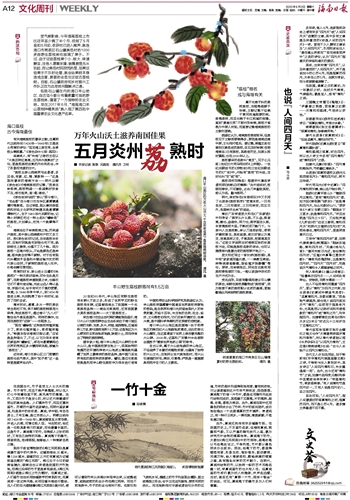 临高举人、有“吟绝”之称的王佐以“火珠压树红离离,五月炎州荔熟时”之句,更是把荔枝成熟的月份和形态,作了形象而完美的交代。