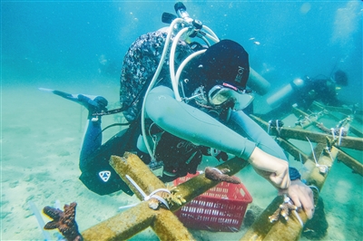 潜水员在陵水分界洲岛附近海域移植珊瑚。 本报记者 王程龙 摄