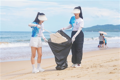 志愿者在三亚海棠湾沙滩清理垃圾。 本报记者 王程龙 摄