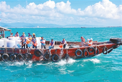 在三亚西岛以西海域人工渔礁区,工作人员将青石斑鱼成鱼投放到海中。 本报记者 王程龙 通讯员 袁永东 摄