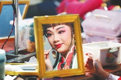 琼剧《孪生驸马》演员在后台做演出准备。本报记者 张茂 摄