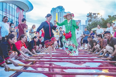 此外,百余幅黎锦装点的黎锦长廊、互动感极强的非遗技艺展示摊位,也是此次三亚“文化和自然遗产日”宣传活动亮点板块。现场特别设置了非遗图片展、非遗特色小吃街、非遗知识问答等,让市民既可以亲身体验本土非遗特色装扮,又可以沉浸式参与顶棍、射箭等趣味体育项目,为群众带来丰富多彩的文化新体验。