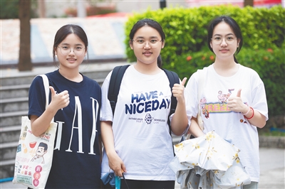 ❸ 6月9日,在海南中学高中部考点,3名考生在考试结束后开心留影。本报记者 张茂 摄