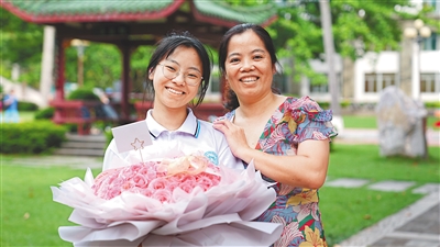 6月9日,在海南中学高中部考点,考完当天最后一门科目后,考生收到家人送来的鲜花。 本报记者 张茂 摄