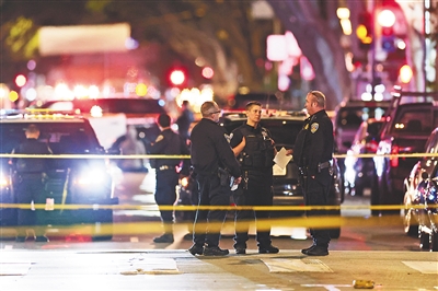 美国加利福尼亚州旧金山市米申区9日晚发生一起枪击事件,导致9人受伤。当地媒体报道,9日21时刚过,一家服装店的开业6周年庆祝活动现场发生枪击事件。图为6月9日,在美国加利福尼亚州旧金山市,警察在枪击事件现场工作。新华社/美联