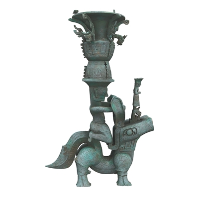 这件文物由上、中、下三部分构成。下层是“神兽”,昂首挺胸、四肢壮硕、威风凛凛。神兽头顶中央还站立着一个衣着华丽的青铜人像。中间层是一个跪在“神兽”背部的铜人像,浓眉大眼,头顶戴冠,上身着曲折云雷纹长袖对襟短衣,下身穿眼形纹短裙,双臂举于胸前。上层为三段式的折肩尊,尊上有龙和兽造型的立体附饰。