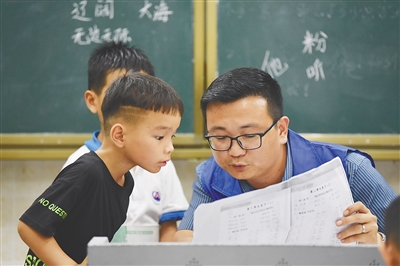 屯昌新兴镇下屯村驻村干部在工作之余,化身志愿者“大昌叔”为孩子们进行课外辅导。通讯员 林小丹 摄