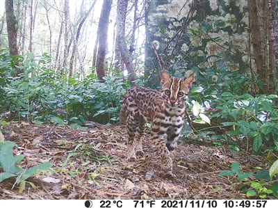 “除了山地林区,城市郊野或村庄附近也会出现豹猫的踪迹。”海口畓榃湿地研究所专家卢刚介绍,这几年他和同事在海口开展生态调查时,经常会发现疑似豹猫的粪便,有时候距离人类活动范围非常近。在2022年度的检测中,海口美舍河、五源河国家湿地公园都拍到了豹猫的踪迹。