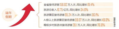 本报海口6月25日讯(记者刘晓惠 通讯员李艺娜)海南日报记者6月25日从省旅游和文化广电体育厅获悉,2023年端午假期,全省接待游客158.82万人次,同比增长19.4%;旅游总收入16.75亿元,同比增长34.6%。其中,旅游景区接待游客95.24万人次,同比增长56.1%;A级以上旅游景区接待游客59.07万人次,同比增长49%;椰级乡村旅游点接待游客28.1万人次,同比增长76.6%。端午假期,全省各地围绕端午传统民俗,深入挖掘和拓展旅游文化内涵,开展了丰富多彩、各具特色的民俗节庆活动。海口市举办主题为“端午节·因为有你,康乐+1℃”的2023海口文旅节庆系列活动;三亚市群众艺术馆采取“馆内+馆外”“线下+线上”多种方式,组织“艾鹿·粽艺传习社”活动;儋州市于端午节当天在海花岛旅游度假区组织“包粽子”达人PK赛;定安县推出端午美食文化节、琼剧戏曲晚会、琼剧正青春等多场活动。