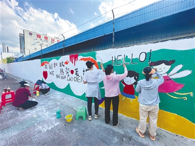 澄迈县老城镇玉堂村文化集市一侧,正在绘制中的文化墙。 本组图片均由本报记者 高懿 摄