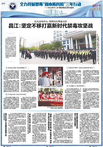 近年来,昌江黎族自治县贯彻落实党中央和省委省政府决策部署,始终将禁毒工作作为重大政治任务紧抓不放、强力推进,坚持以人民为中心,坚持厉行禁毒方针,以创建“无毒品危害自由贸易港”为目标,扎实开展禁毒三年“固本防风险”行动,全力以赴打好2023年禁毒攻坚战,为自贸港建设和昌江绿色可持续高质量发展营造无毒害社会环境。A