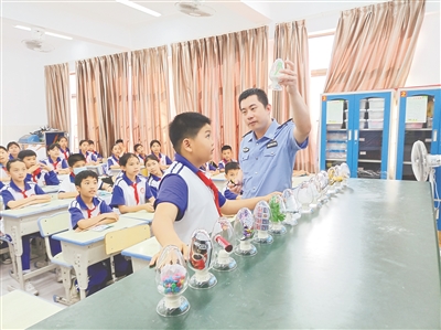 民警通过介绍仿真毒品,让学生了解毒品的危害。