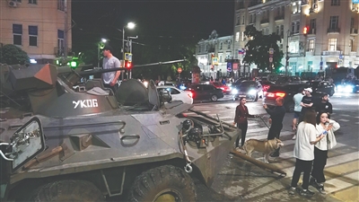 六月二十四日,在俄罗斯顿河畔罗斯托夫,当地居民站在装甲车旁。新华社发