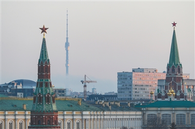 在俄罗斯首都莫斯科拍摄的克里姆林宫(前)和奥斯坦基诺电视塔(后)。 新华社发