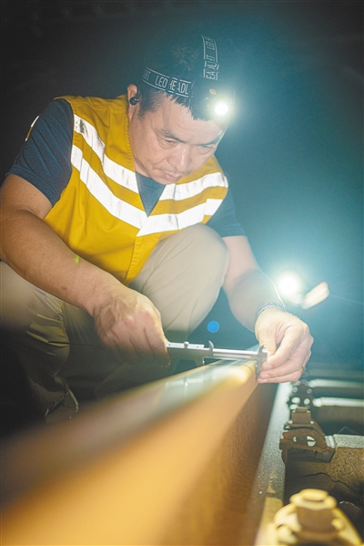 夜色更深了,尽管工作已经结束,但在返回的路上,左洪亮仍会用手电筒检查他的团队检修过的每一处,时不时用脚踩一踩扣件。