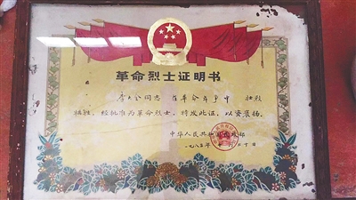 李大全的革命烈士证明书。