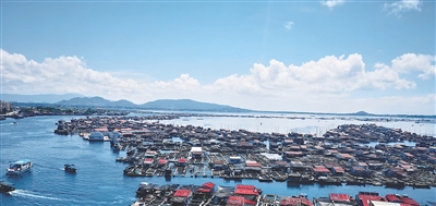 一个个深海网箱满载丰收,在南湾附近的海域,转产转业的渔民忙着往网箱里投喂鱼料,“向海而兴”是该县发展农业的一大方向。