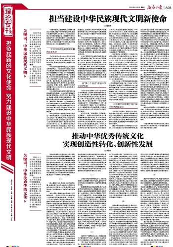 担当起建设中华民族现代文明新使命,必须推动中华优秀传统文化创造性转化、创新性发展。实现创造性转化、创新性发展,就要明晰其中的逻辑前提、基本方法、基本路径、基本要求及使命担当。