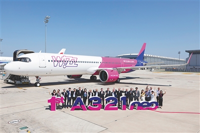 6月27日在天津拍摄的向匈牙利威兹航空交付的A321neo飞机。新华社发