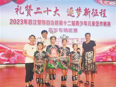 除了织锦,钟诚还着重培养孩子们的音乐特长。“山里的孩子有着天赋异禀的歌喉,这种纯洁、淳朴、原生态的声音,很有感染力。”钟诚介绍,2023年,该校学生参加昌江第十二届青少年儿童艺术展演声乐专场,张宝月、吉春梅、韩佳欣、韩佳琪(组合)获小学组一等奖。