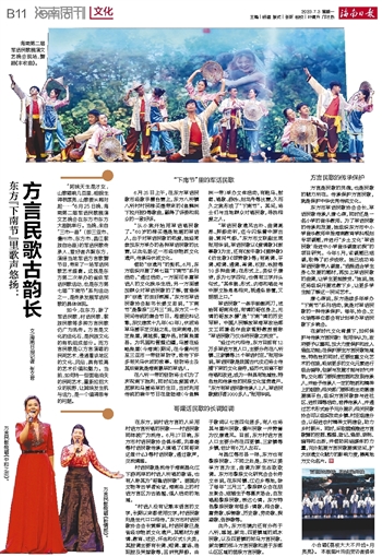 如今,在东方,除了军话民歌,村话民歌、黎族民歌等多种方言民歌仍广为流传。方言是文化的活化石,是民族文化的有机组成部分。而方言民歌是以方言演唱的民间艺术,浸透着该地区的文化、风俗,具有较高的艺术价值和魅力。当前,如何将一些面临消失的民间艺术,重新拉回大众的视野,让其焕发生机与活力,是一个值得思考的问题。