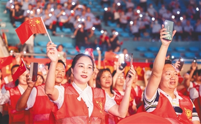 现场观众挥旗致敬。 海报集团全媒体中心记者 李昊 摄
